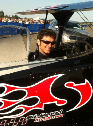 Skip feels comfortable saying that he is one of the very best in the business today. Skip's flying has been featured in magazines that include Plane & Pilot, Smithsonian Air & Space, AOPA, Sports Illustrated, World Airshow News, Auto Pilot, as well as in multiple other domestic and international publications. Skip Stewart is the first pilot to fly an airplane under a jumping motorcycle at an Airshow and he also flies with several other pilots forming shows such as the renowned TinStix of Dynamite Act.